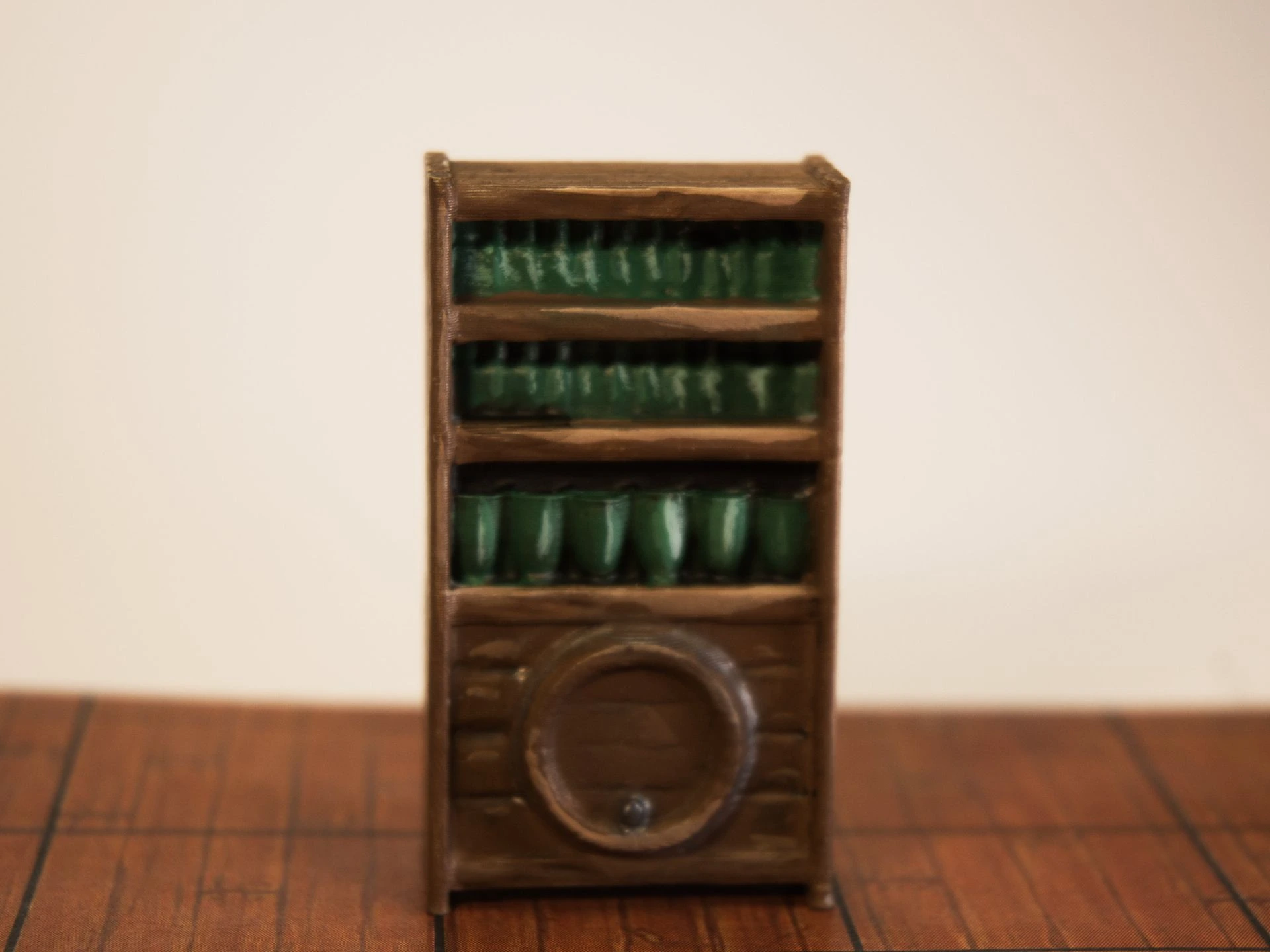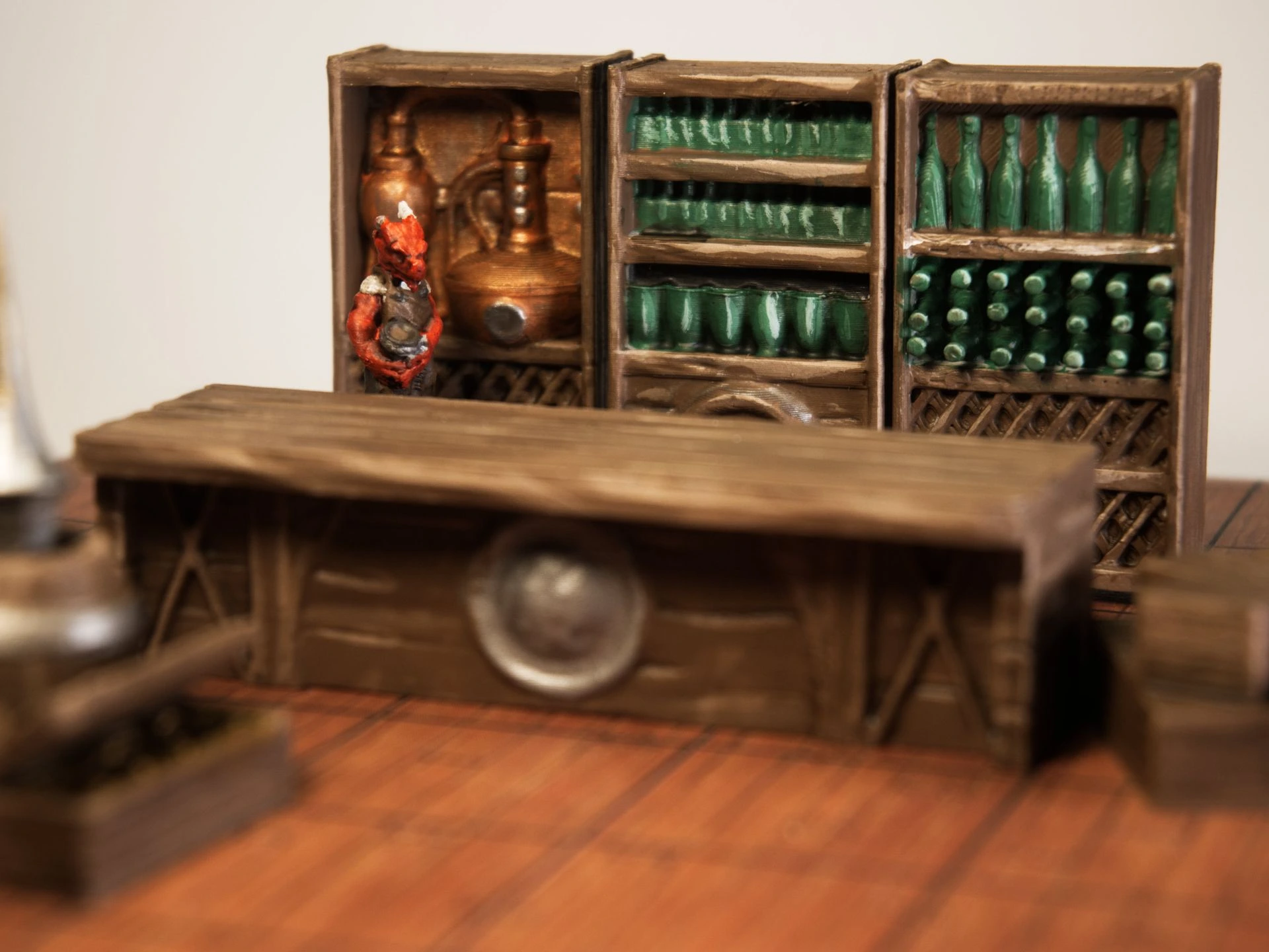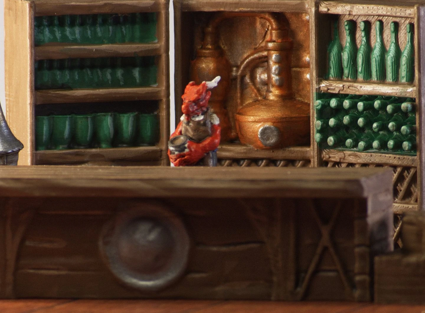 Das Design für das Kern stück war recht simple ein Bartresen ein paar Regale und das kleine Herzstück der bar ein regal mit Brau Kessel perfekt für einen passenden Look. Der Wirt ist ebenfalls eine meiner ersten richtigen Miniaturen davor hatte ich schon andere designe jedoch nie auf dem Niveau wie diesem.
