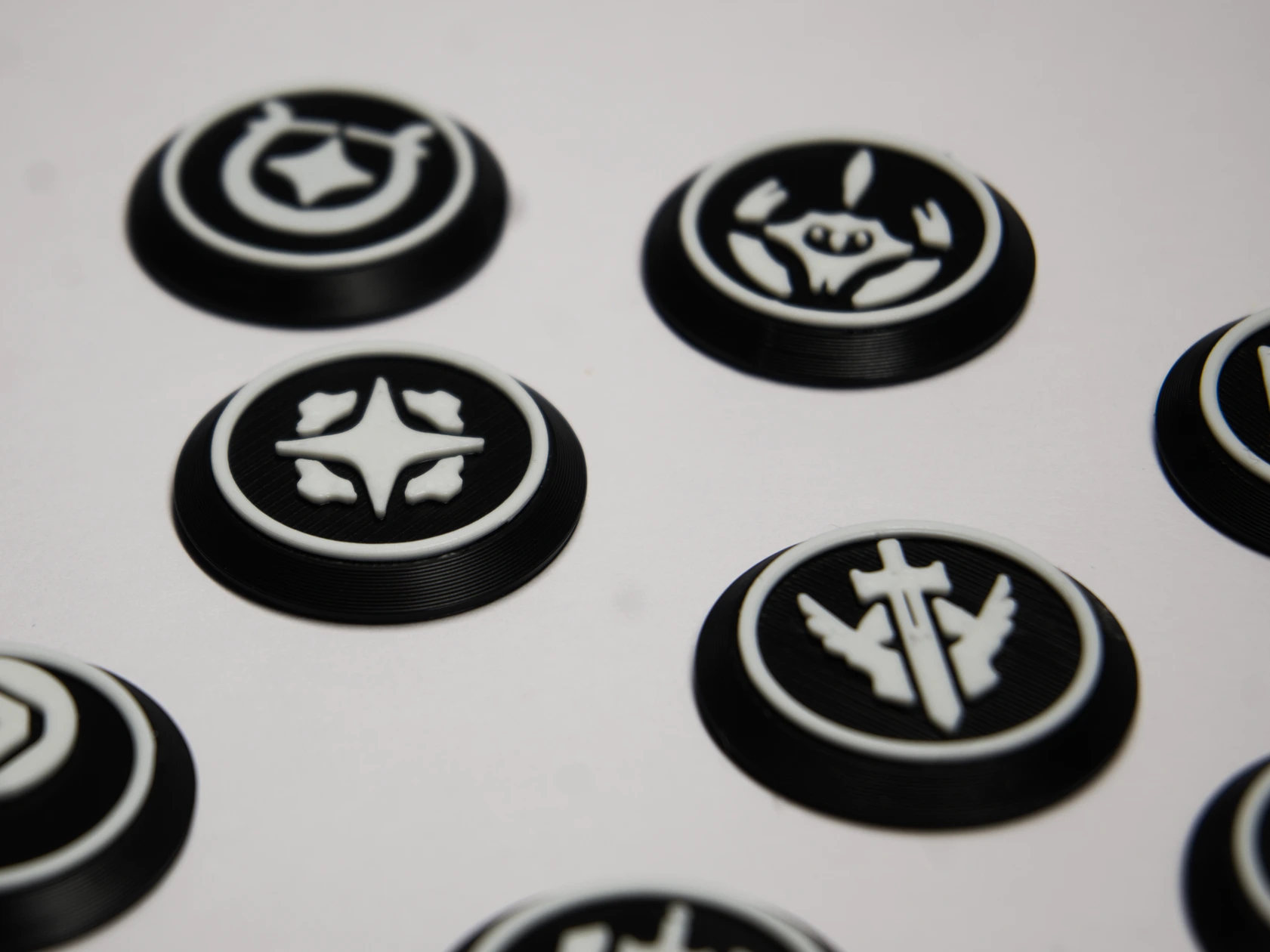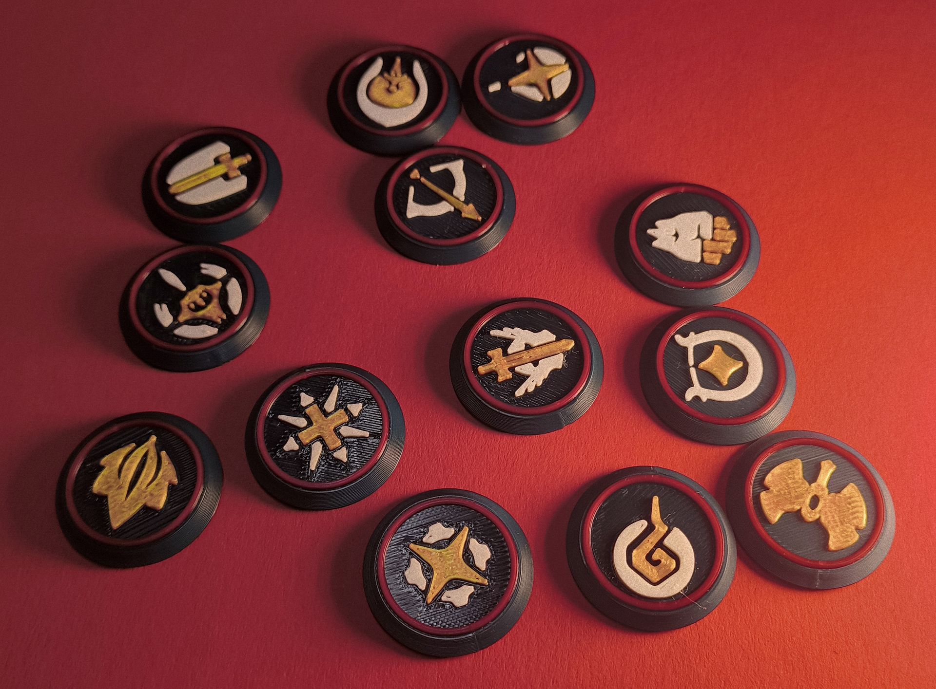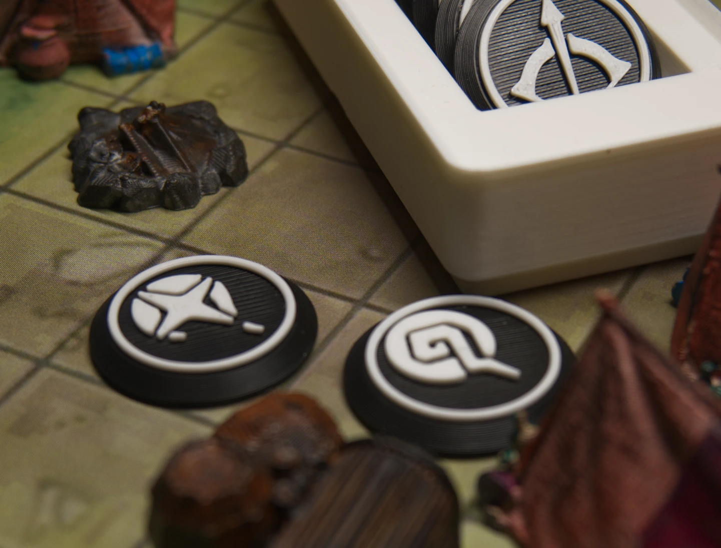Oft werden solche Tokens benutzt um bestimmen ob ein man jemanden angreifen kann oder ob ein Zauber treffen kann. Die Einfachen Holzblöcken von früher sind wars schön aber wenn j emand gerne eine andere Farbe habe will oder ein anderen Look dann wird das schwierig. Daher das Farbe und Symbol System hier.